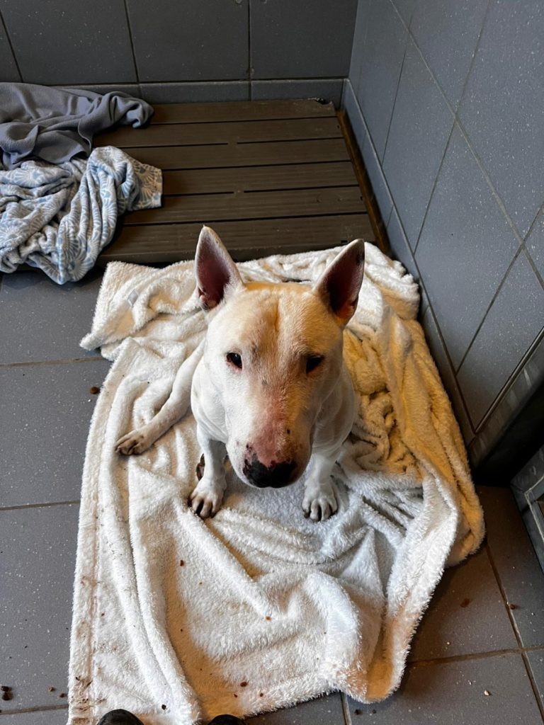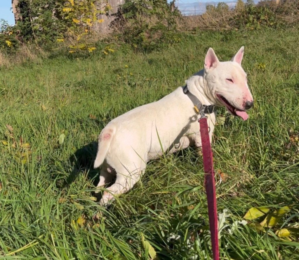 OJ est un amour de Bull Terrier une fois le lien créé. C’est un chien sensible et lumineux, malgré le fait qu’un de ses yeux ne voit plus. Gentil, tendre et profondément attachant, il a seulement besoin qu’on le comprenne.